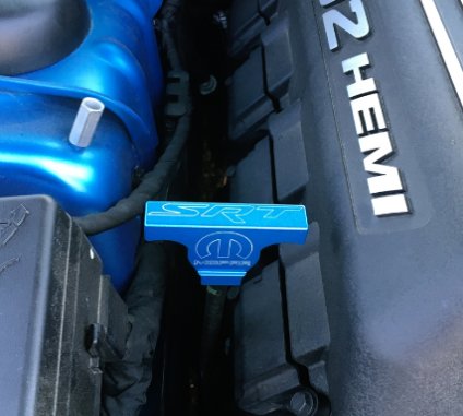 This 2008-2019 Dodge Challenger or Charger Mopar licensed Dipstick Handle Cover from PFYC is professionally machined and painted from premium 6061 billet aluminum and finished with a durable paint coat and your choice of several logos. Installs within minutes and is made in the U.S.A.
